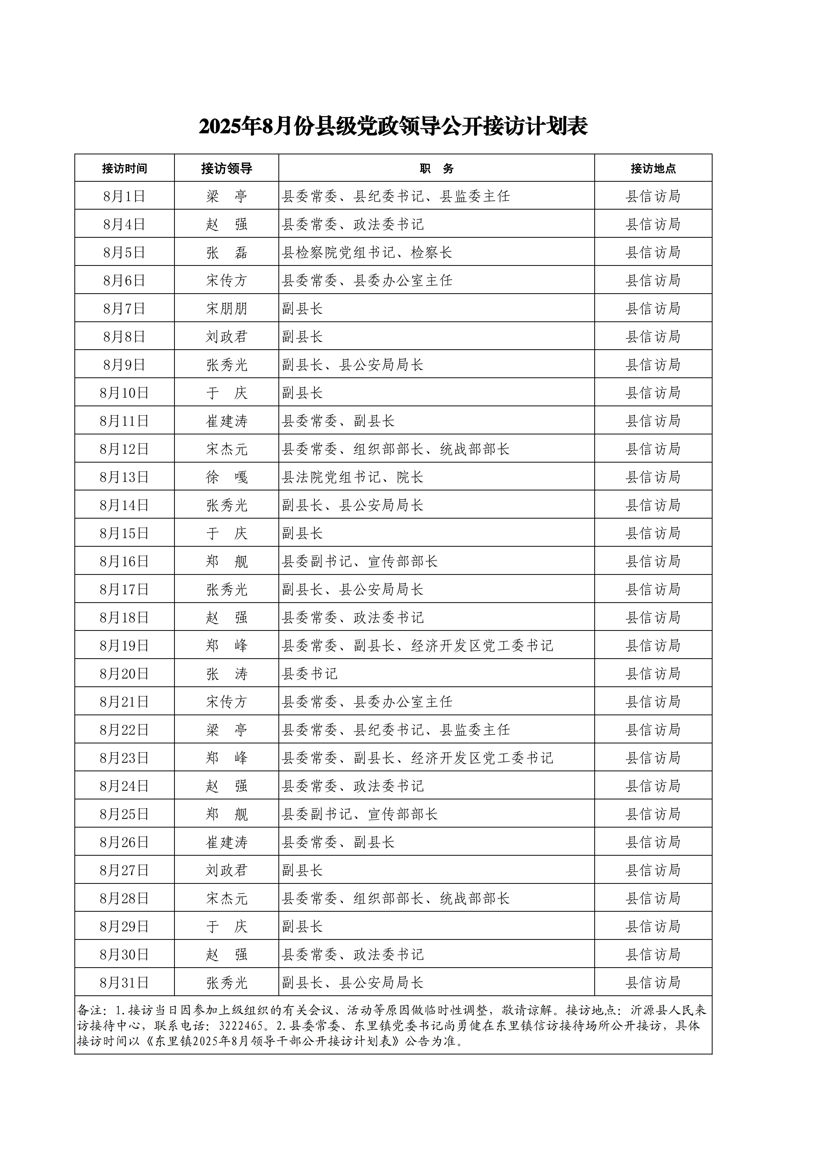 标题: 2025年8月份县级党政领导公开接访计划表