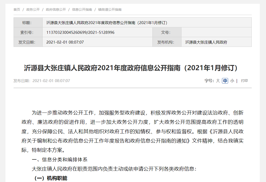 沂源县大张庄镇人民政府2025年度政府信息公开指南(2025年4月修订)