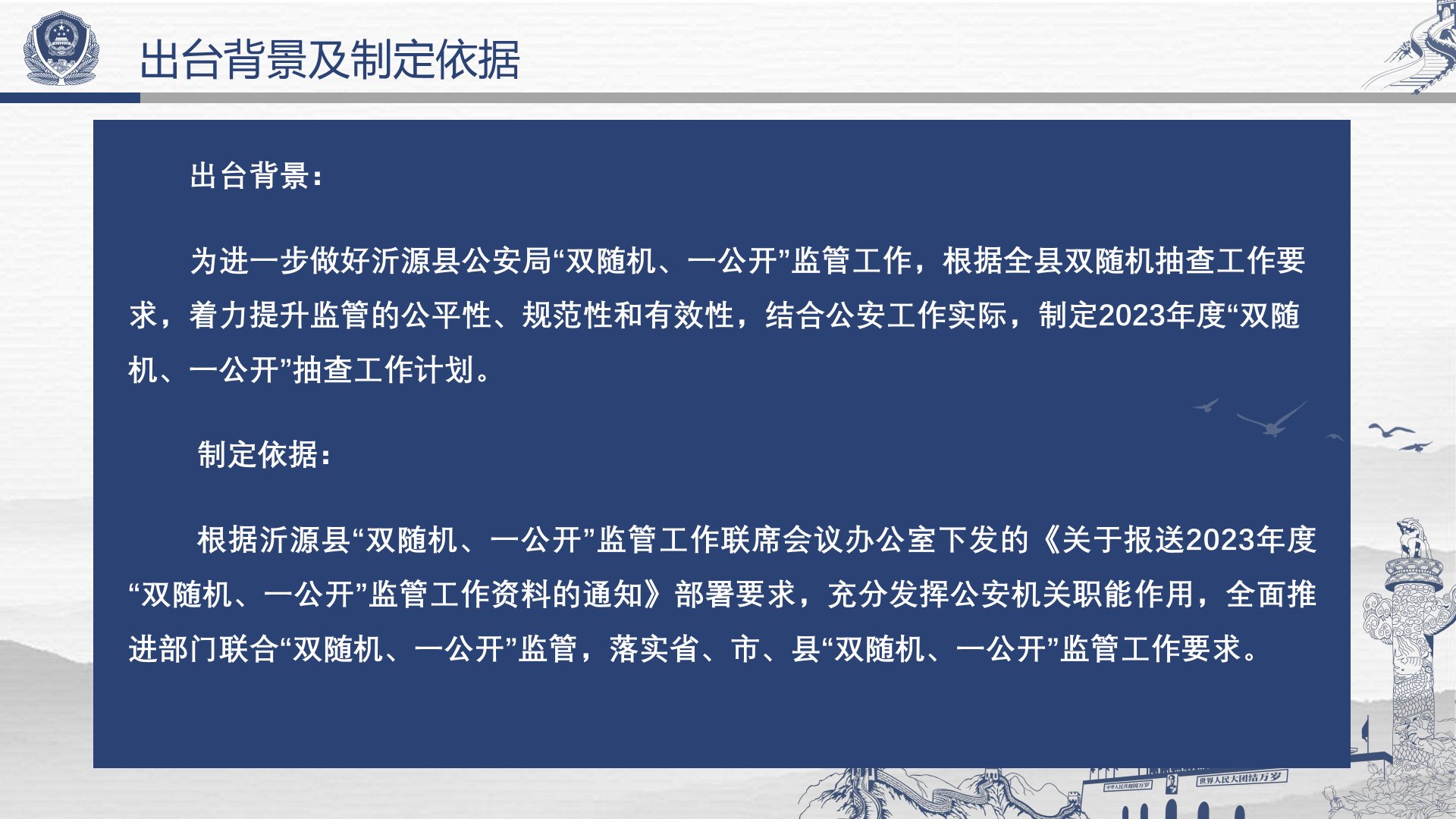 关于《沂源县公安局2023年度 “双随机、一公开”抽查工作计划》的政策解读