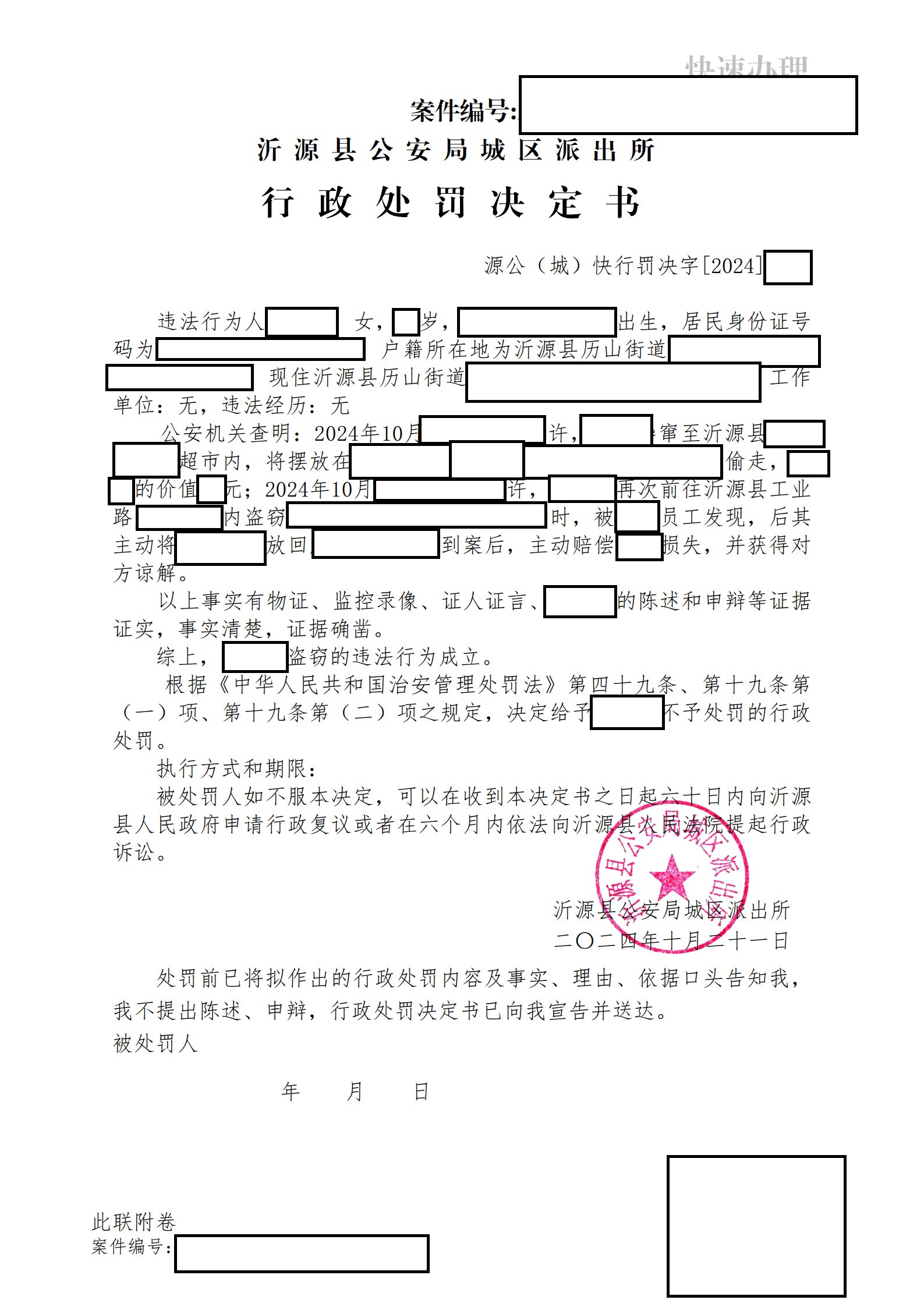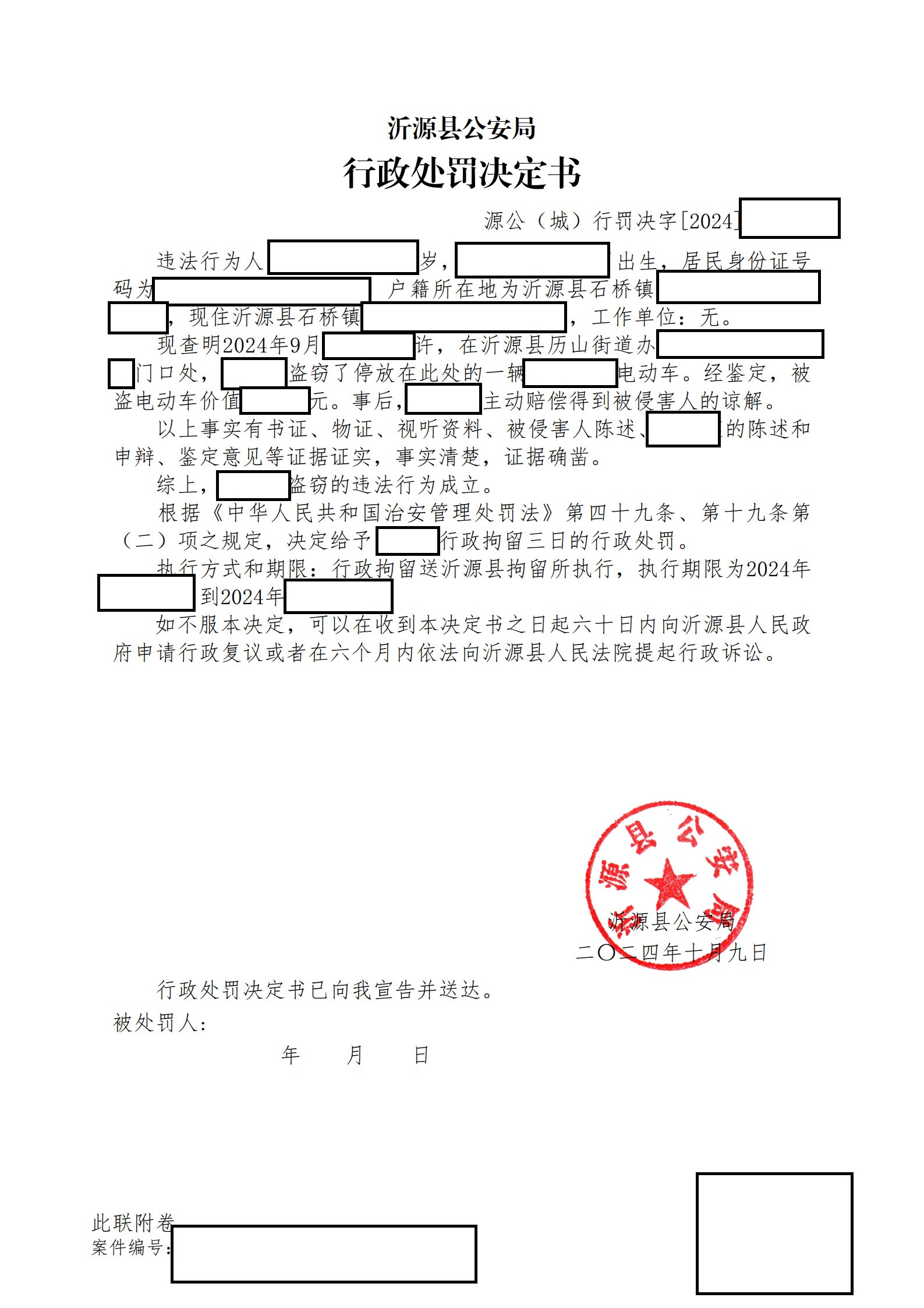 沂源县公安局2024年第四季度行政处罚决定书