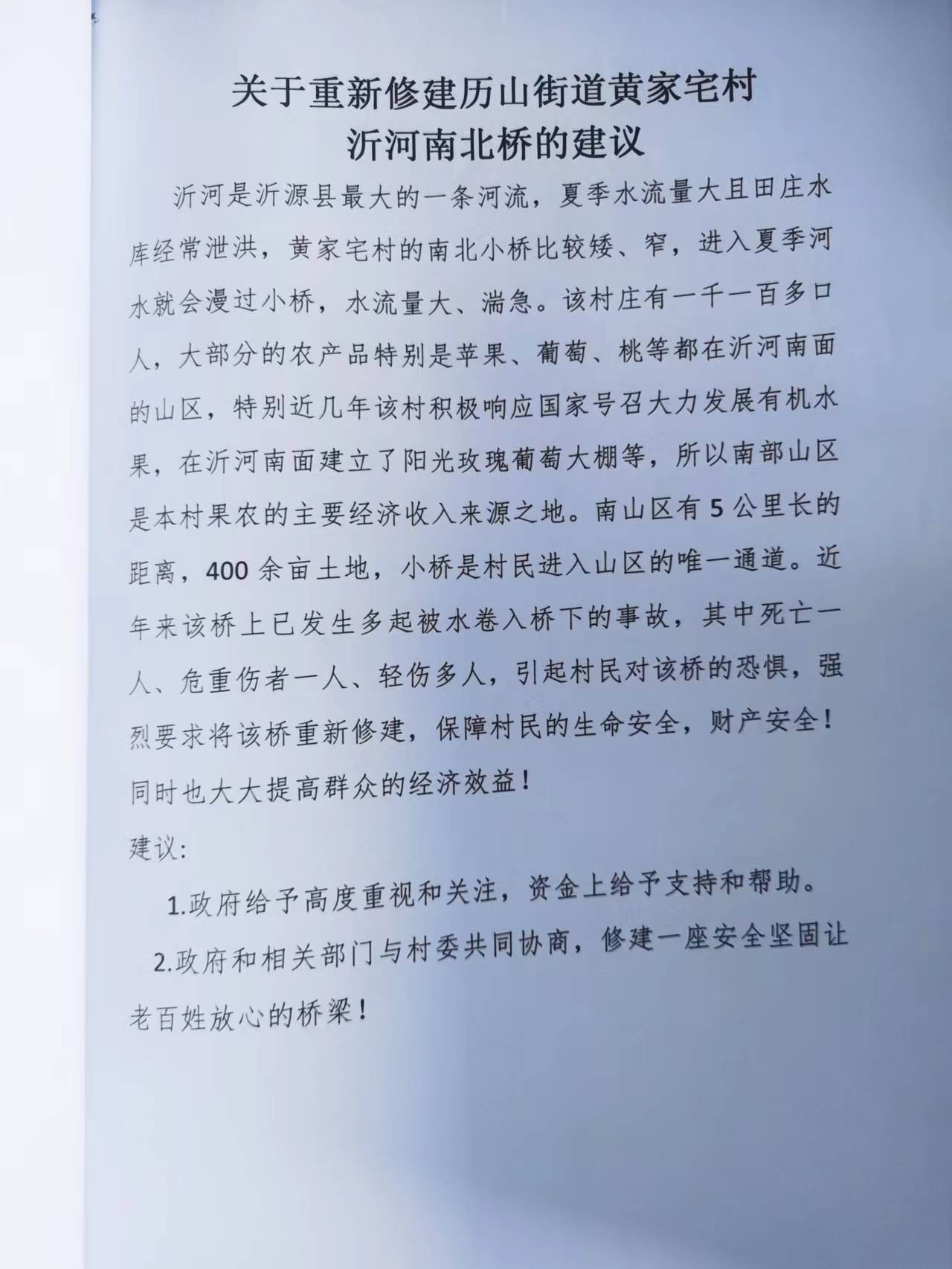 您提出的关于重新修建历山街道黄家宅村沂河南北桥的建议收悉。现答复如下:
