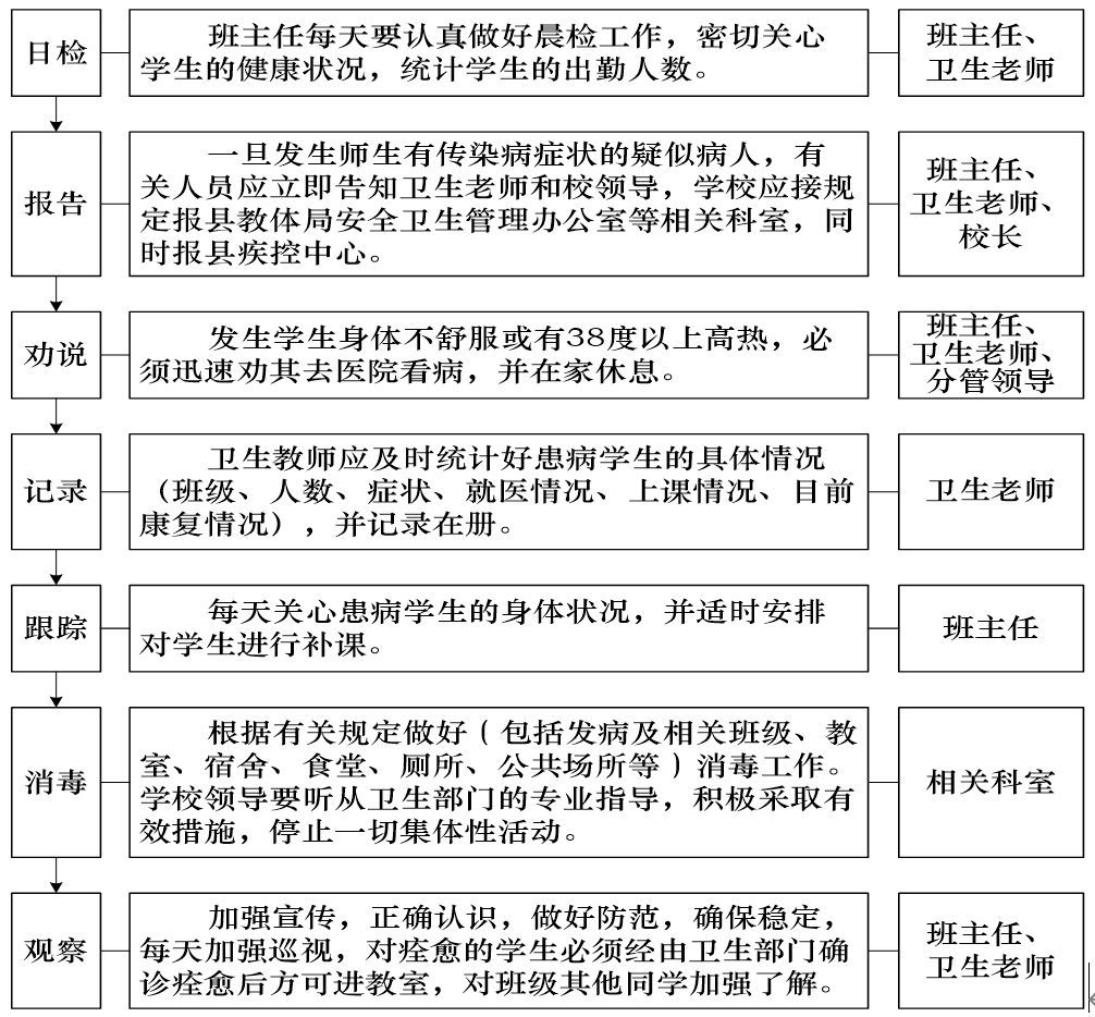4、学校应普及卫生知识,通过各种形式,做好预防宣传教育工作,并定期召开班主任例会,加强有关预防传染病的知识培训,保证每周20分钟的健康教育,教会师生防病知识,培养良好的个人卫生习惯。