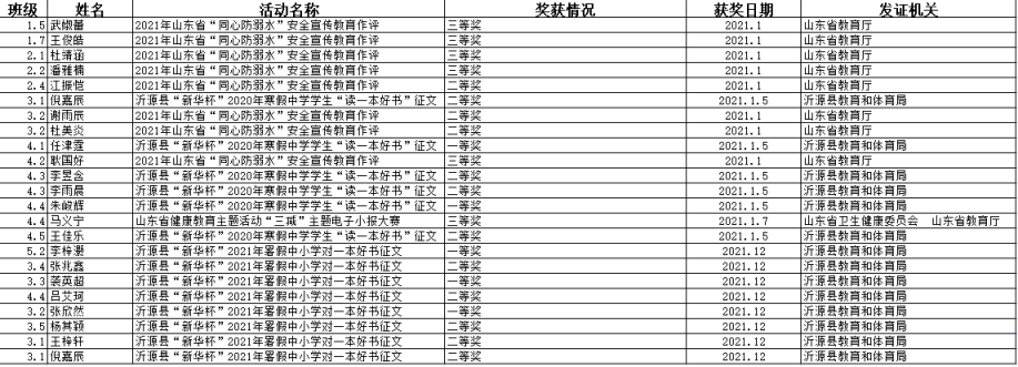 | 3.5王佳乐 | 红领巾心向党少先队献词大赛 | 二等奖 | 2021年5月 | 青共团沂源县委、沂源县教育和体育局、沂源县少工委 |