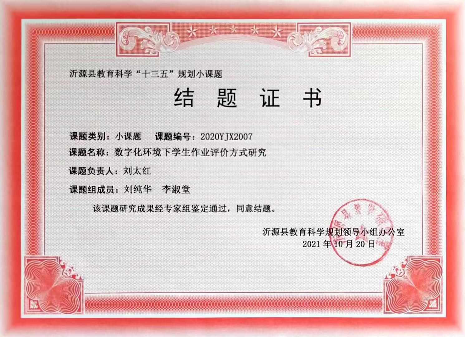 沂源县历山街道办事处荆山路小学刘太红小课题结题证书