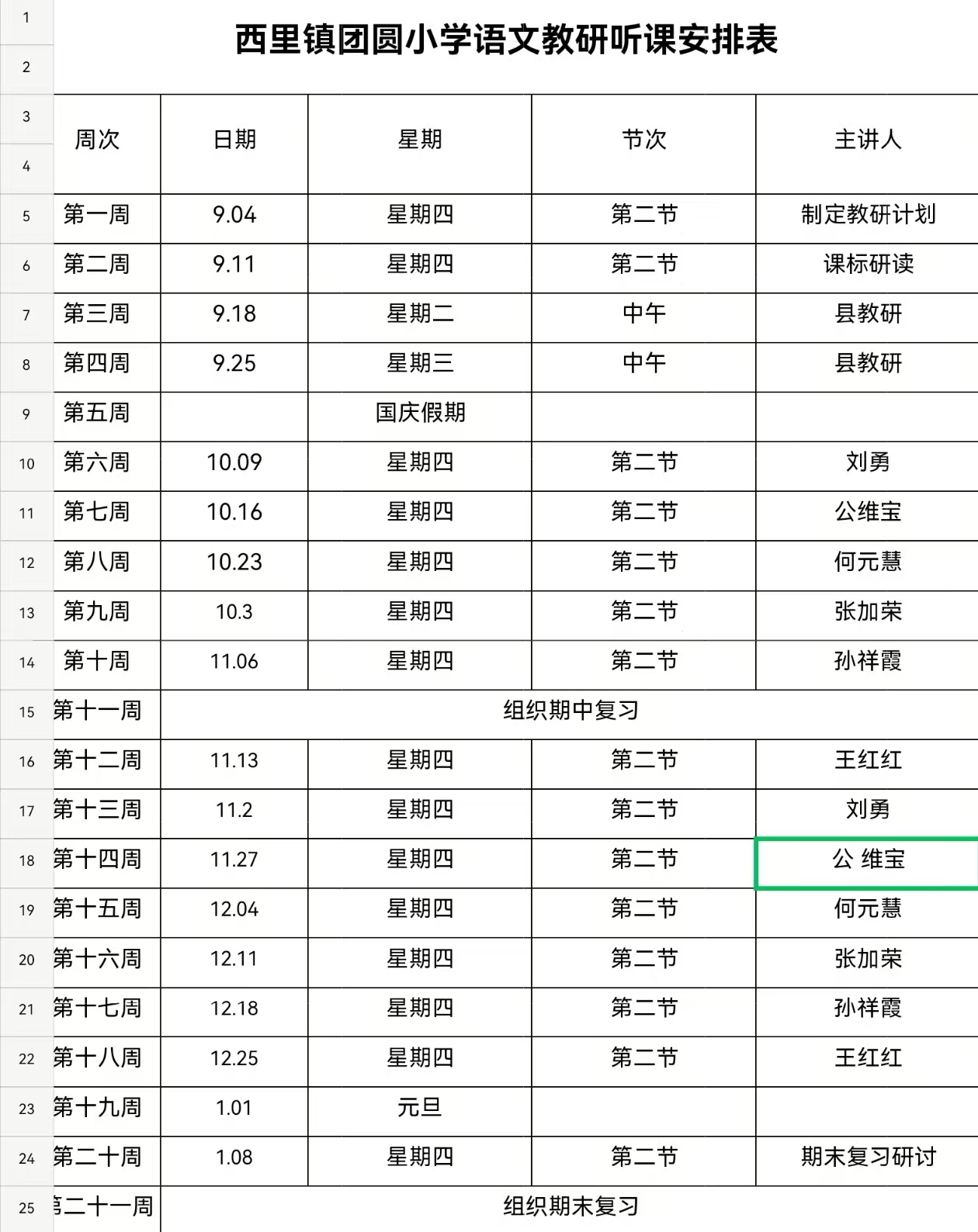 沂源县西里镇团圆小学2025-2026学年第一学期语文教研组教研听课安排表