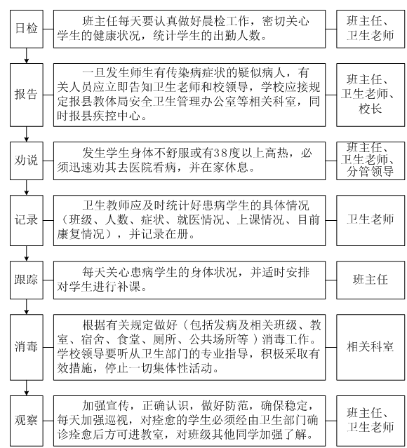 3、学校应建立各项卫生工作责任制,完善考核制度,明确各部门工作职责,并指定卫生老师做好每天晨检工作,认真填写学生日检统计表,保证学校预防疾病控制工作的顺利开展。