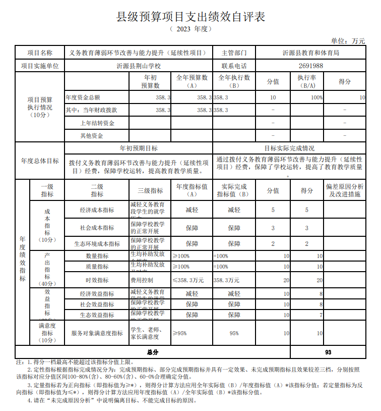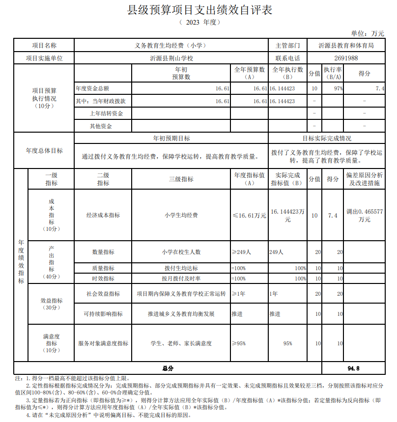 (二)县级预算项目绩效自评结果。沂源县荆山学校2023年度县级预算绩效自评的5个项目中,5个项目自评等级为优。从自评情况看,项目支出绩效管理的重视程度进一步提升,项目有序开展,执行和完成情况较好,资金使用比较规范,但也存在项目实施进展比较慢等问题。