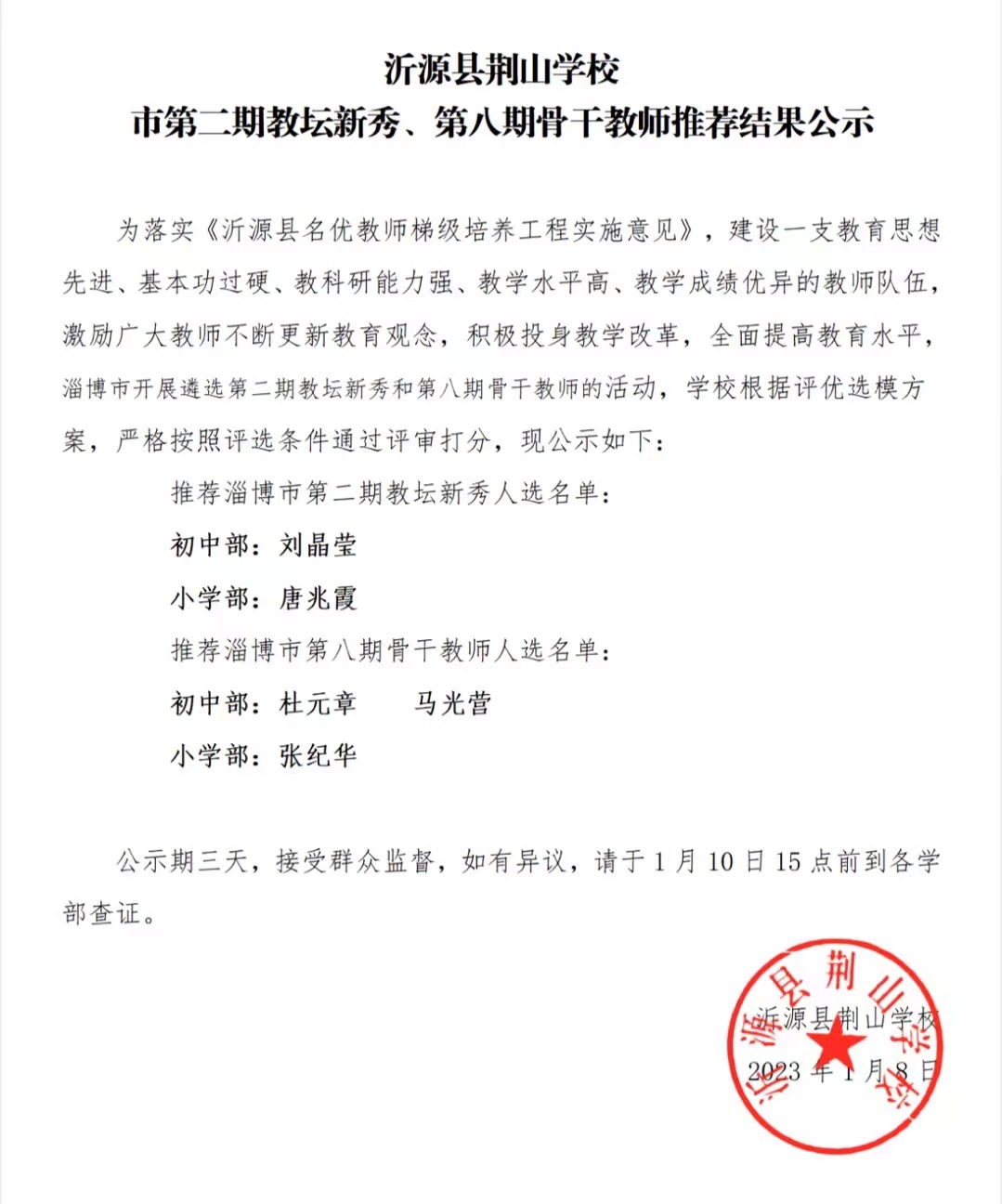 沂源县荆山学校评优选模拟推荐人员名单