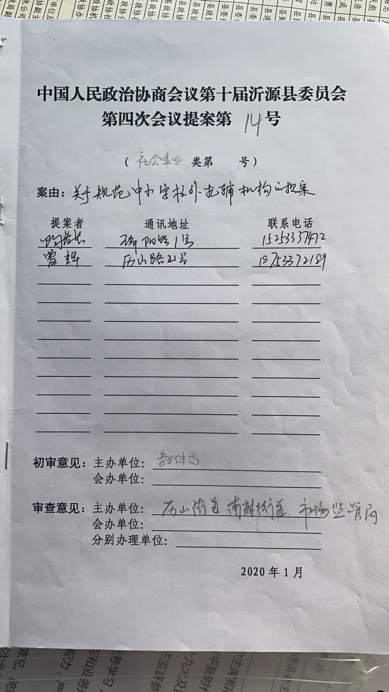 中国政治协商会议第十届沂源县委员会第四次会议提案第14号“关于规范中小学校外托辅机构的提案”已收悉,现答复如下: