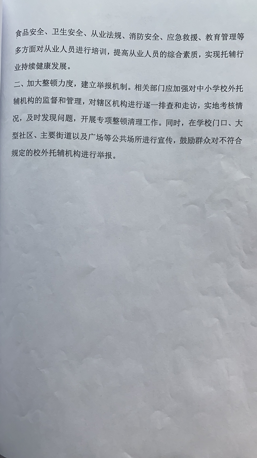 针对于中小学校外托辅机构,南麻街道教体办具体做了以下工作:1、疫情后开学,教体办参加了教体局组织的开学检验,对各个机构从疫情演练、消杀、隔离,培训、上下学、外来人员登记等方面进一步规范,并提出了整改意见。2、积极对辖区内校外托辅机构进行逐一排查走访,配合县级管理部门进行专项整顿。3、开展了对辖区内校外辅导机构抗震加测,消防手续自查,安全隐患检查,对不合格的建筑及时督促整改。4、加大了对在校生及家长的教育力度,引导其不去无手续、有安全隐患的校外托辅机构,鼓励对不符合规定的校外托辅机构进行举报。