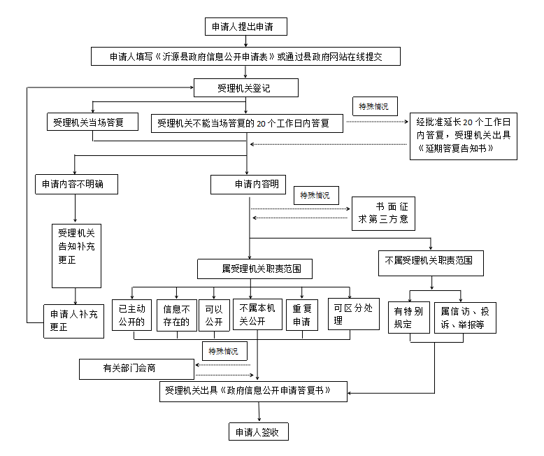 本机关办理申请人政府信息公开申请时,能够当场答复的,将当场答复;不能当场答复的,自收到申请之日起20个工作日内予以答复;确需延长答复期限的,延长答复时间不超过20个工作日,并告知申请人。政府信息涉及第三方权益的,应当征求第三方的意见,征求第三方意见所需时间不计算在期限内。