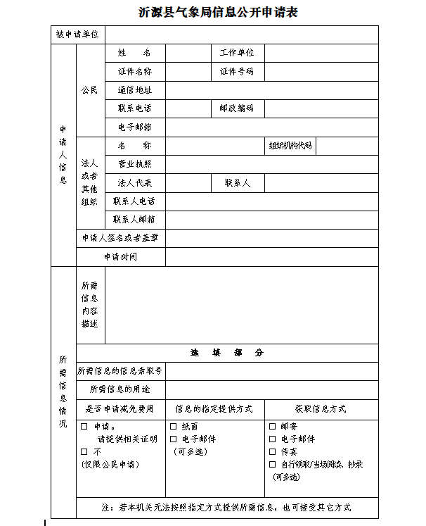 向本机关申请获取政府信息,应当书面填写《沂源县政府信息公开申请表》(以下简称《申请表》)。《申请表》可以从县政府网站下载、打印,复制有效。申请人对申请获取信息的描述应尽量详尽、明确;若有可能请提供该信息的标题、发布时间、文号或者其他有助于确定信息内容的提示。 申请人可向本机关当面递交《申请表》,也可通过信函方式寄送《申请表》,寄送时请在信封左下角注明“政府信息公开申请”字样。