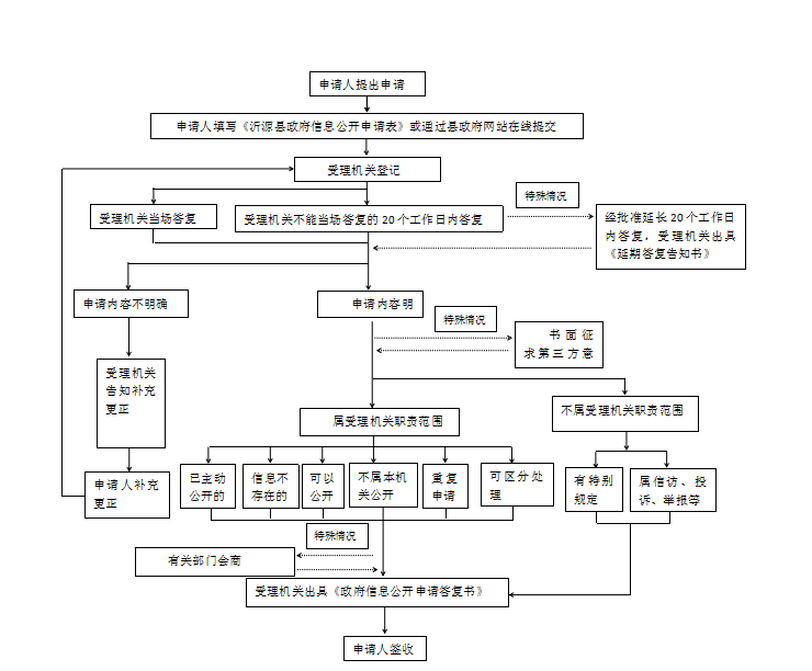 本机关办理申请人政府信息公开申请时,能够当场答复的,将当场答复;不能当场答复的,自收到申请之日起20个工作日内予以答复;确需延长答复期限的,延长答复时间不超过20个工作日,并告知申请人。政府信息涉及第三方权益的,应当征求第三方的意见,征求第三方意见所需时间不计算在期限内。