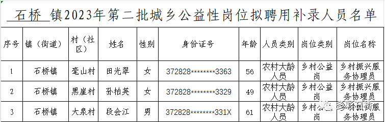 石桥镇2023年第二批城乡公益性岗位拟聘用补录人员名单公示
