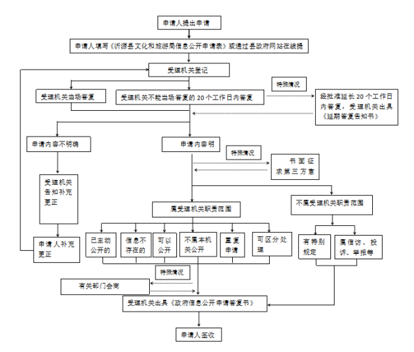 对申请人提出的政府信息公开申请,本机关将根据不同情况分别作出答复,详见本机关处理政府信息公开申请流程图(见附件2)。机关办理申请人政府信息公开申请时,能够当场答复的,将当场答复;不能当场答复的,自收到申请之日起15个工作日内予以答复;确需延长答复期限的,经政府信息公开工作机构负责人同意,延长答复时间不超过15个工作日,并告知申请人。《条例》另有规定的,从其规定。