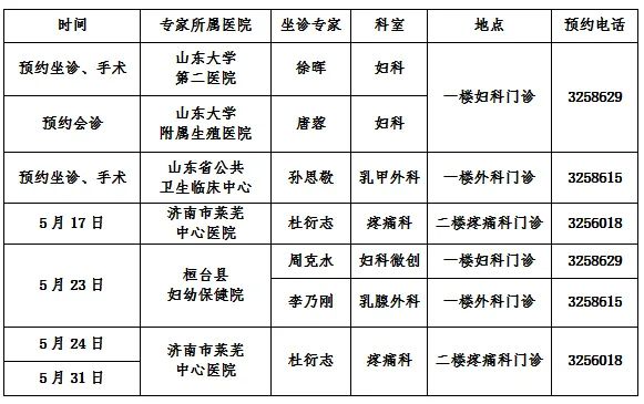沂源县妇幼保健院近期专家坐诊预约(5月17日--5月31日)